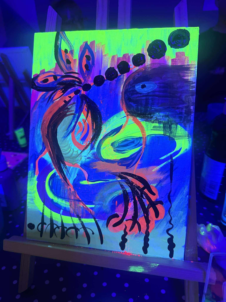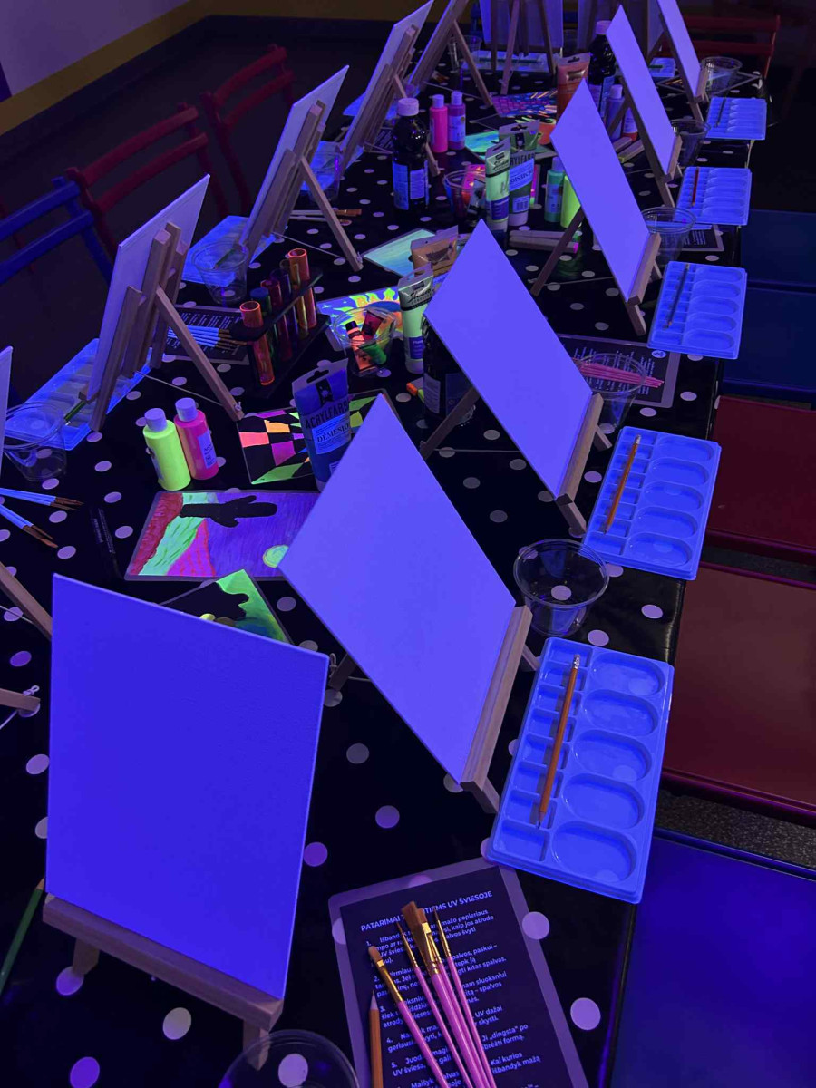 Prieblandoje švytintys paveikslai, spindintys dažai ir molbertai sukurs ypatingą atmosferą, kurioje vaikai galės pasijusti tikrais menininkais. Edukatoriaus padedami, jie kurs savo unikalius šedevrus, o kiekvienas potėpis UV šviesoje atgis naujomis spalvomis.